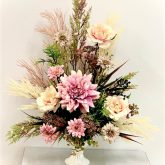 - 生花の他、時折プリザーブドフラワーやアーティフィシャルフラワーなどトレンドの花材も使いながら制作する楽しみをさらに広げます。