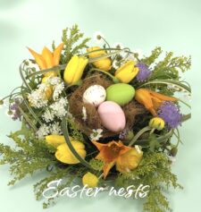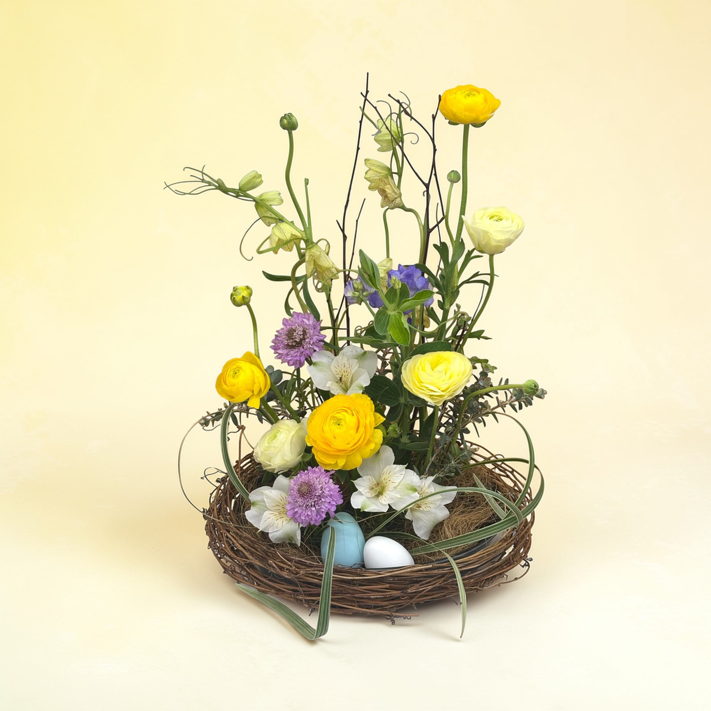 鳥の巣にイースターエッグをあしらったアレンジメントを