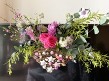 さて、アレンジはピンクのバラやクルクマ等メインのお花を低めに入れて、