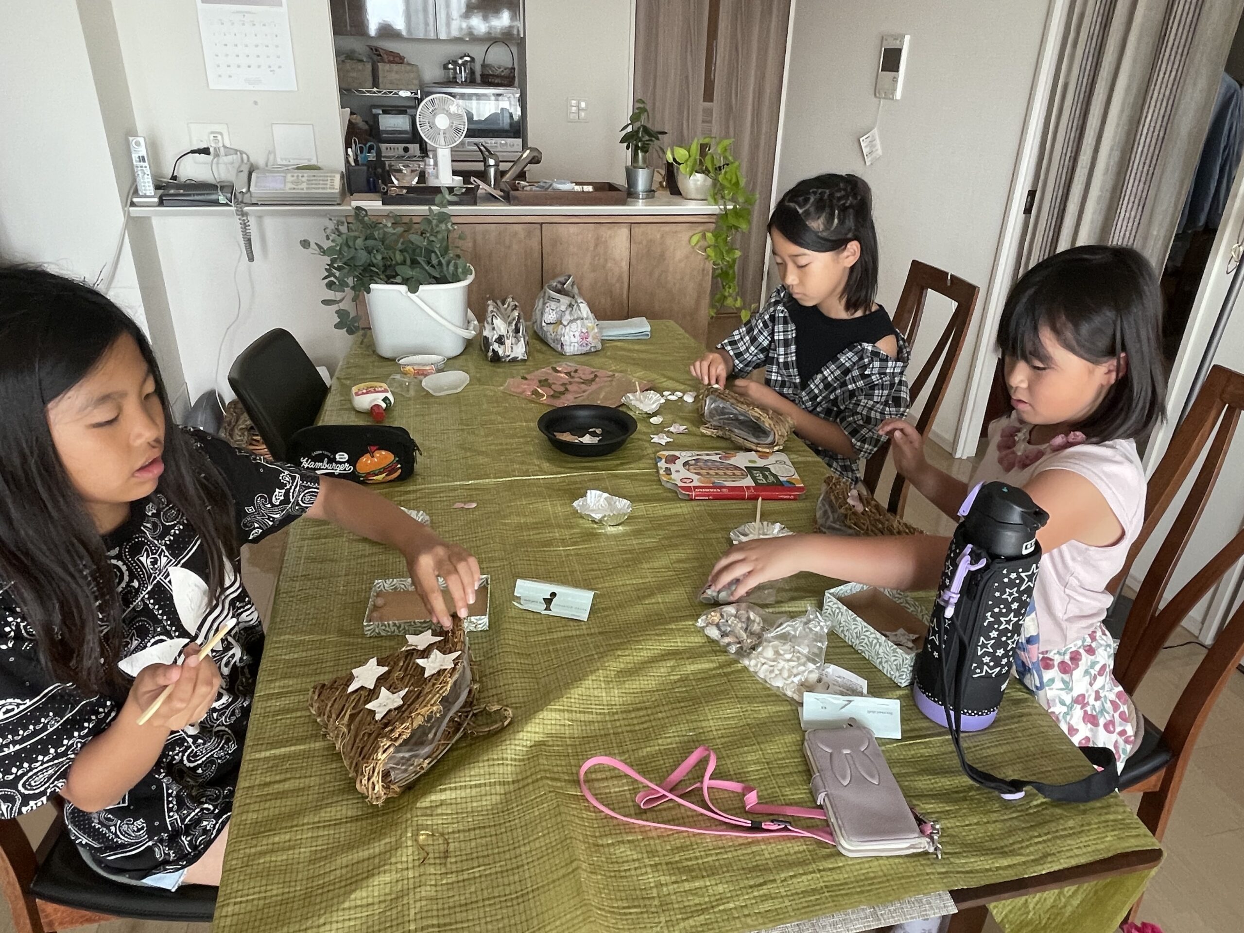 材料は持ち寄った貝殻や星形のチップ、ローズクオーツ等を自由に選んで