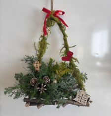 もう一つは木製の器に針葉樹やお花、キラキラの飾り、マツカサなどを